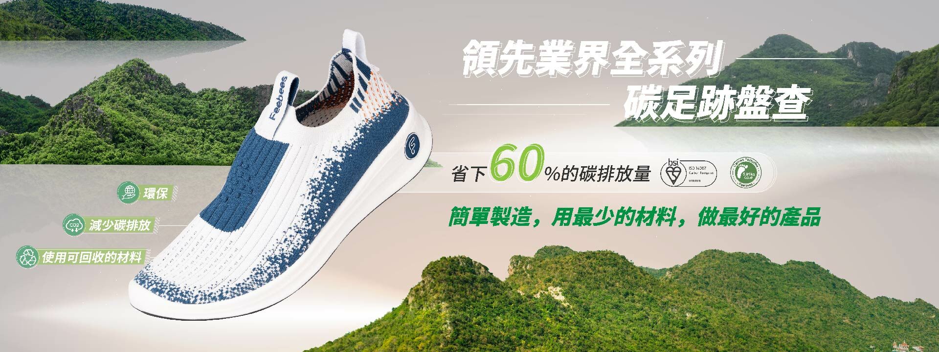 我們捨棄傳統製鞋的模式,追求簡單製造的極限,減少能源消耗和廢棄物產生,襪鞋一體成型,最終達到全品項碳足跡盤查只有5.91~5.277公斤,比起一般市售鞋減少60%的碳排放,以創新的思維環境保護,體現Feebees原本是為孩子而創立品牌,只想給孩子最自然的鞋的初衷。