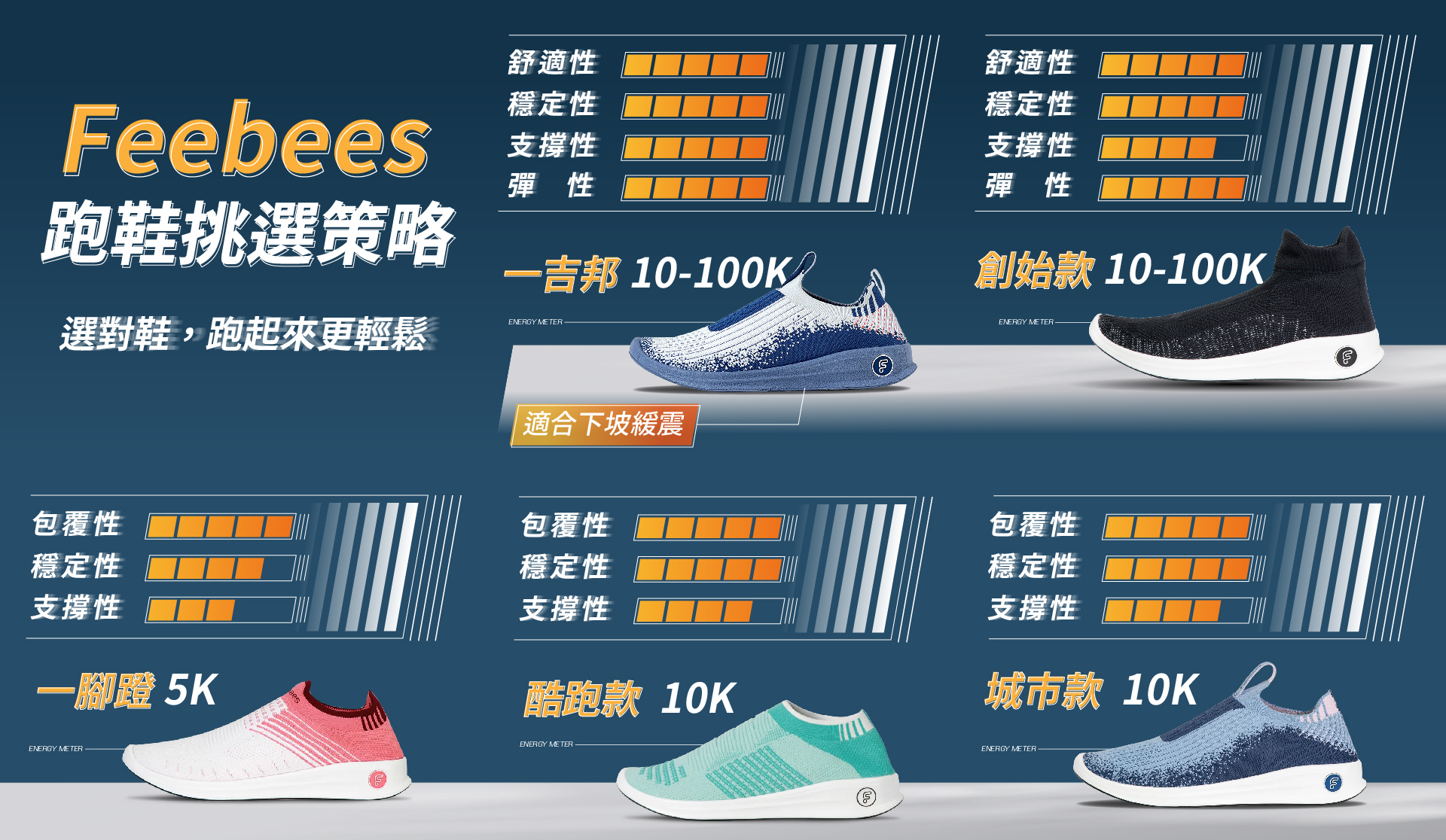 『城市款』與『一腳蹬』都是適合5公里~10公里內的休閒跑步,訴求是不用手就可以穿上,版型比較寬鬆一點,主要是方便與外型的差異。