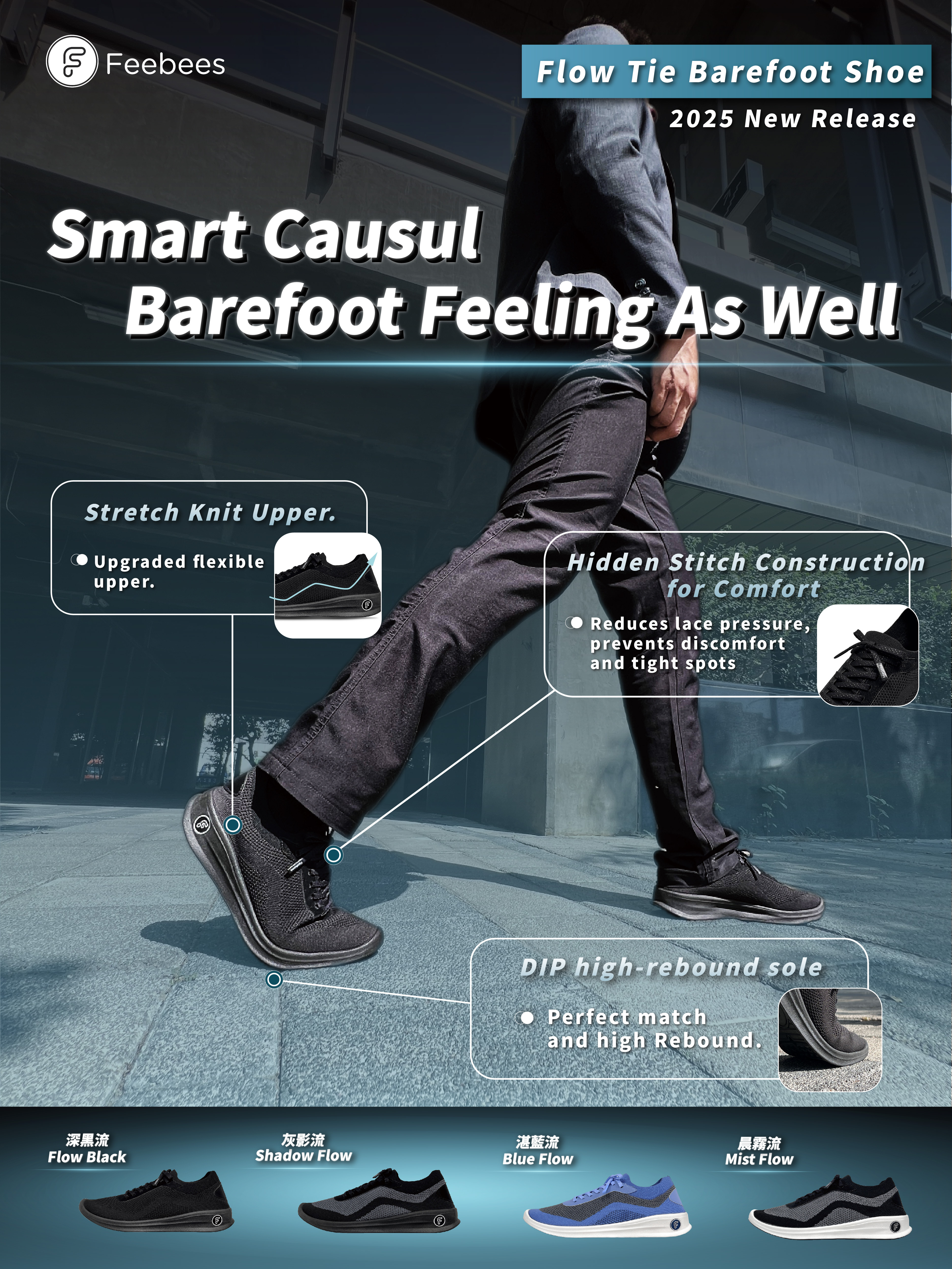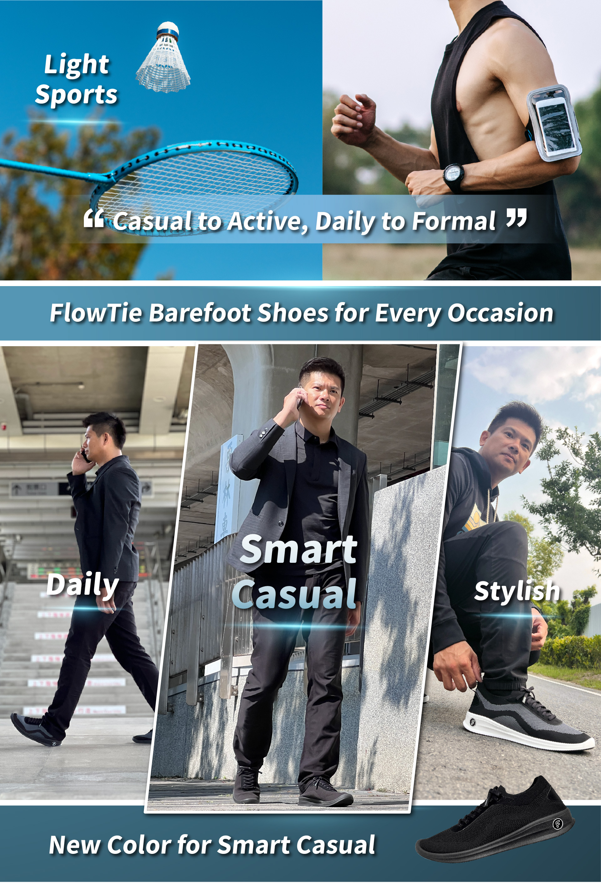 FlowTie expands the possibilities of barefoot footwear — from daily walking and light sports like table tennis and badminton, to smart-casual looks for business settings. More than just a training or running shoe, it's an everyday shoe that seamlessly blends function with style.