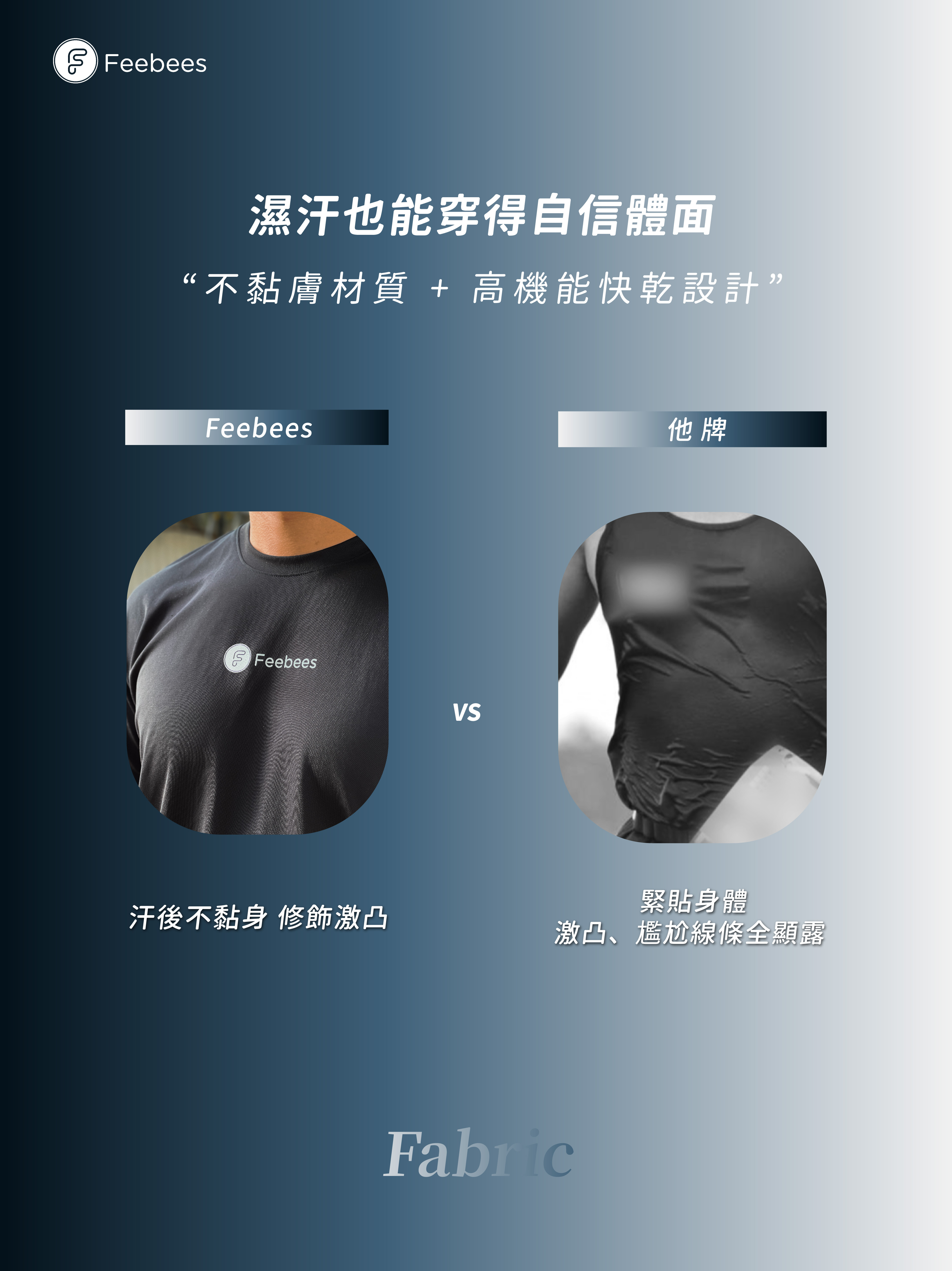 Feebees 流動衣選用不貼膚材質 + 高機能快乾設計,即使大量流汗也不尷尬。