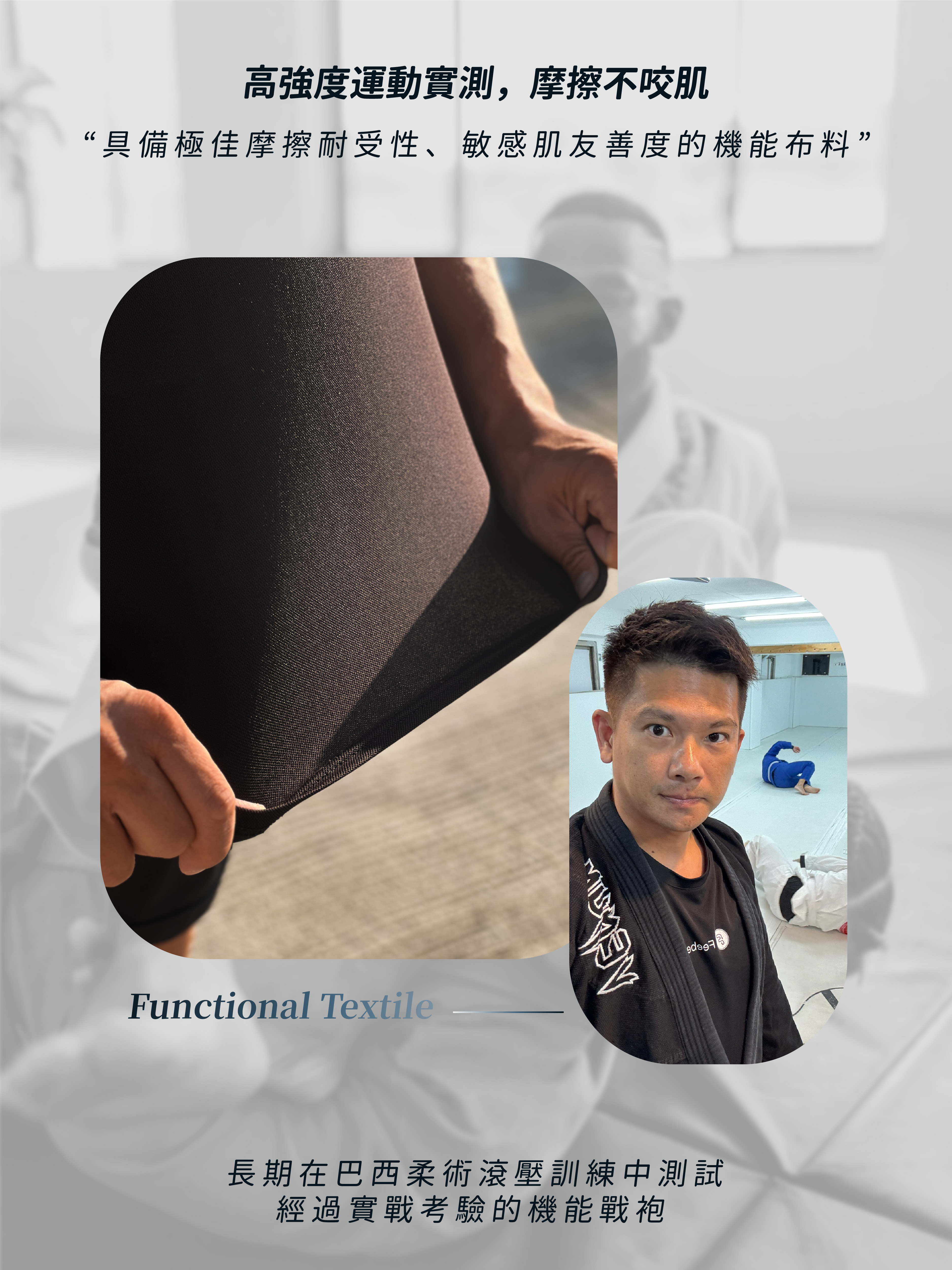 創辦人長期在巴西柔術滾壓訓練中實穿測試,證實此款機能衣具備極佳「摩擦耐受性與敏感肌友善度」,即使反覆動作壓擠,也不咬肌、不刮皮。