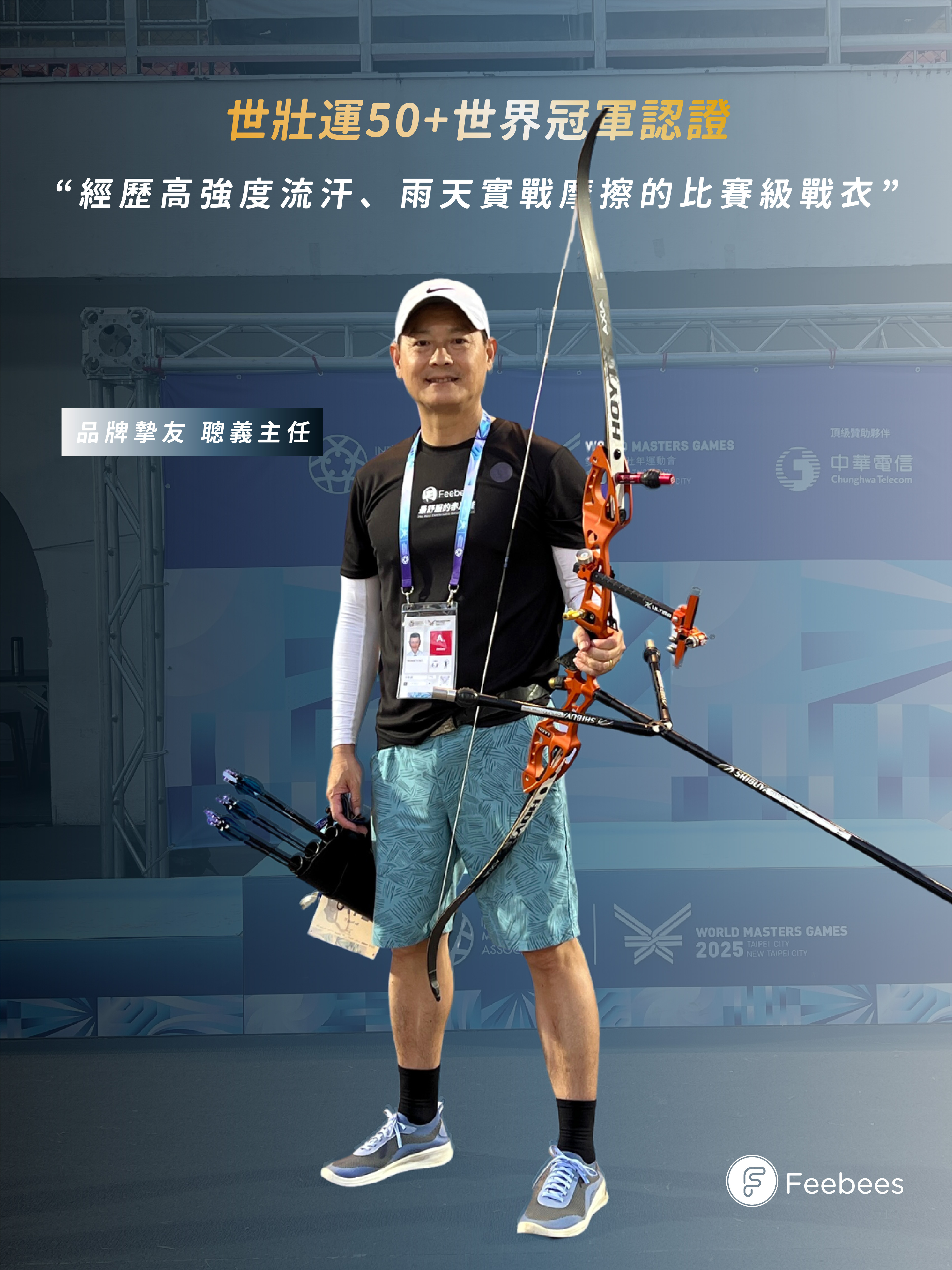 這款 Feebees 機能運動衣,正是品牌代言人、世壯運 50+ 世界冠軍 吳聰義主任於雨天奪冠時所穿。