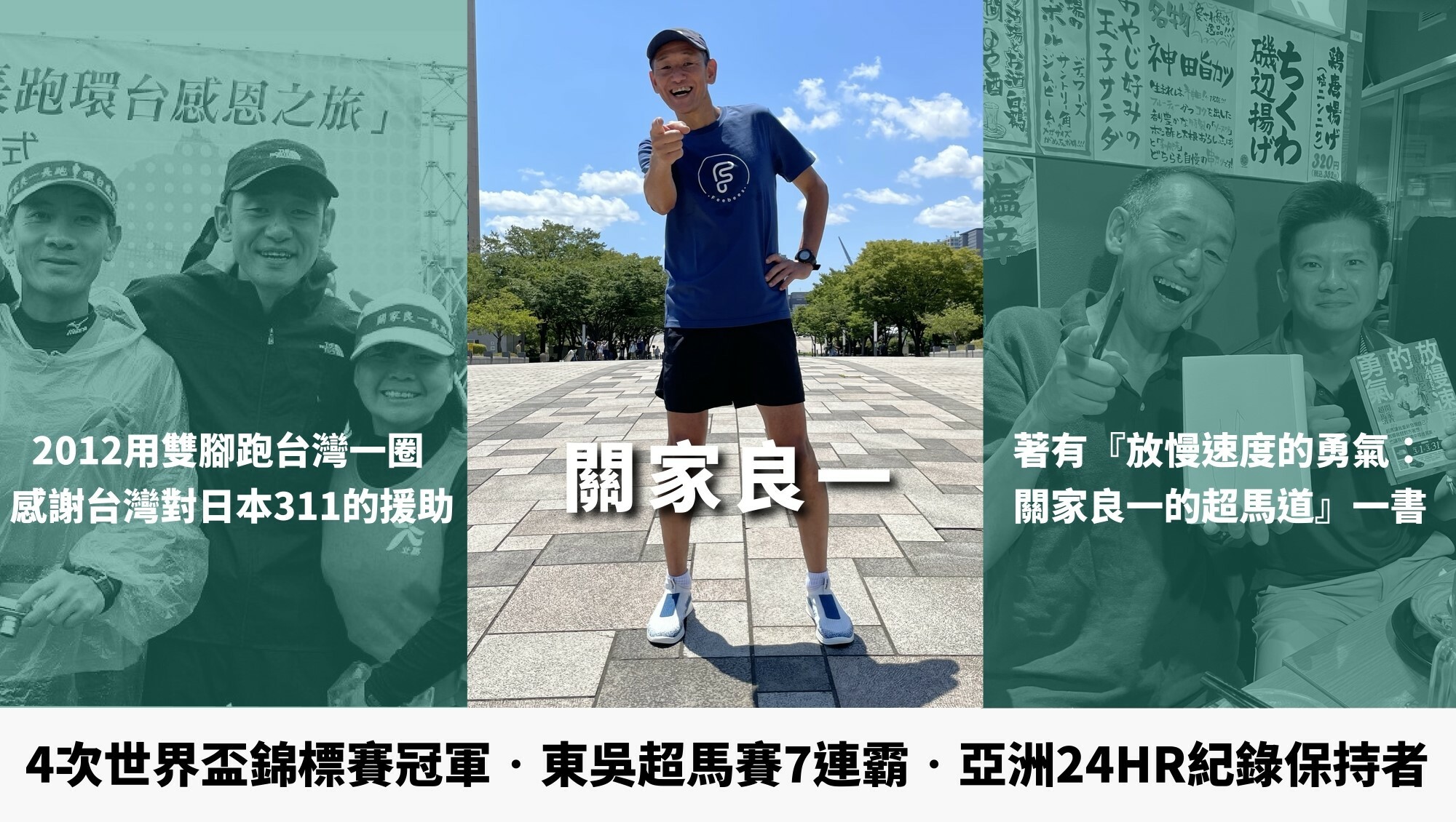 關家良一是一位日本傳奇跑者,他曾4度拿下「超馬世界盃錦標賽」冠軍,奪得2屆超馬界頂尖賽事「希臘斯巴達松超級馬拉松賽」冠軍,並連續7次贏得「東吳國際超馬」冠軍。