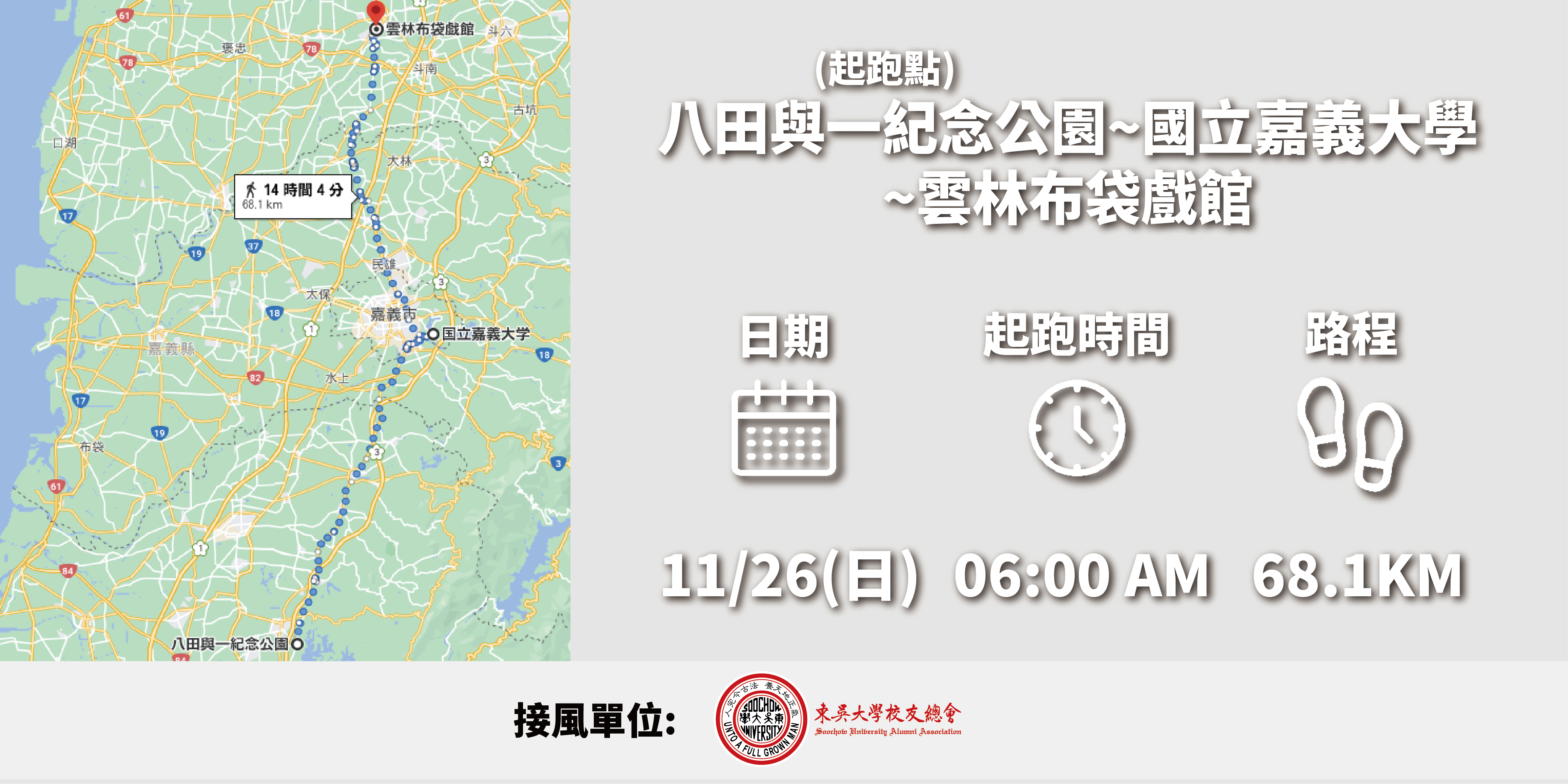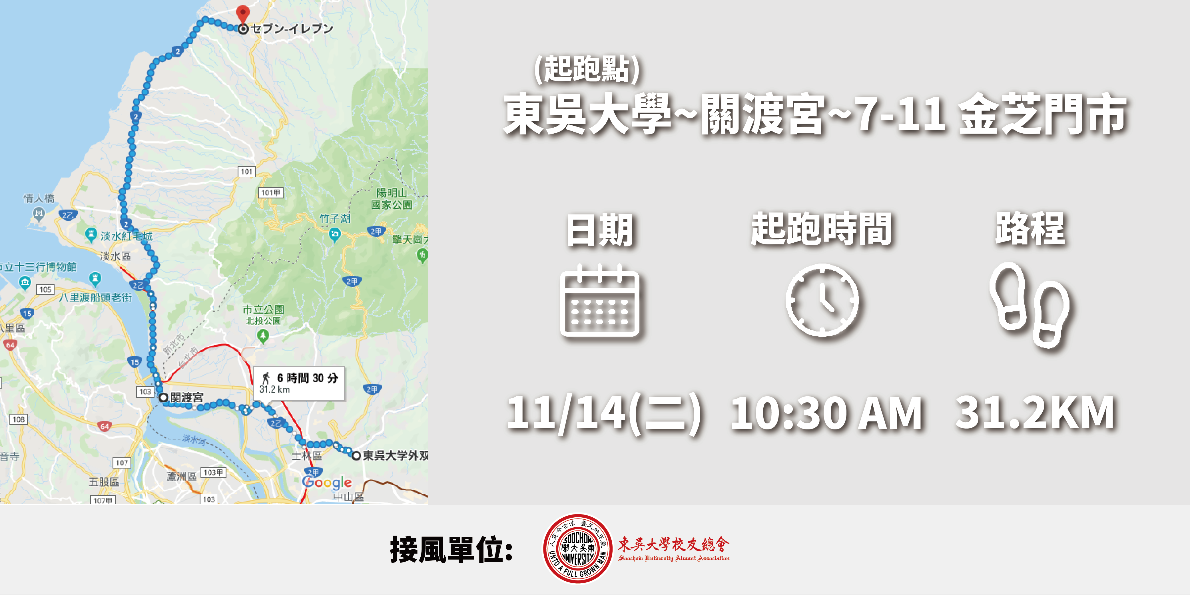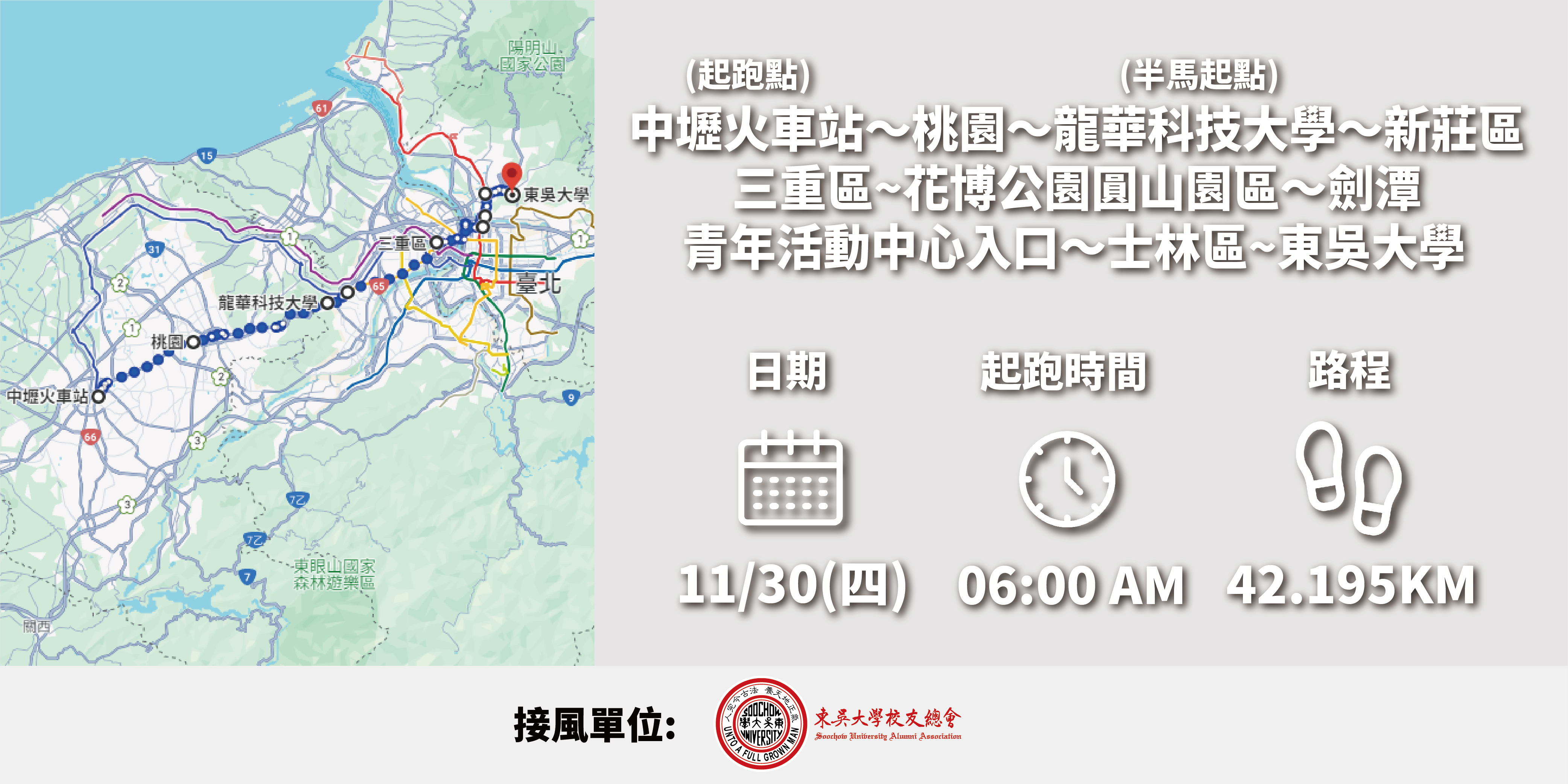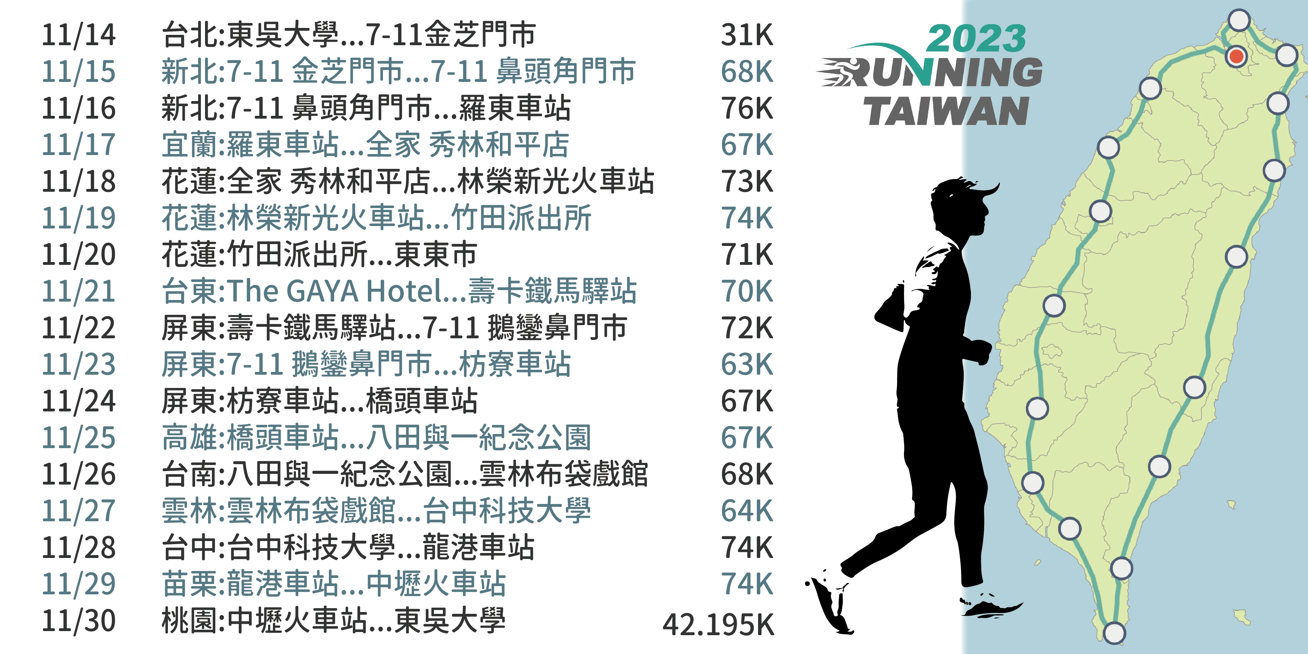 第一站將在東吳大學開幕 早上10:30開始,由北至南、東至西,繞行台灣一圈,總長1100公里,並邀請全台的跑者、民眾一同來陪跑和交流。