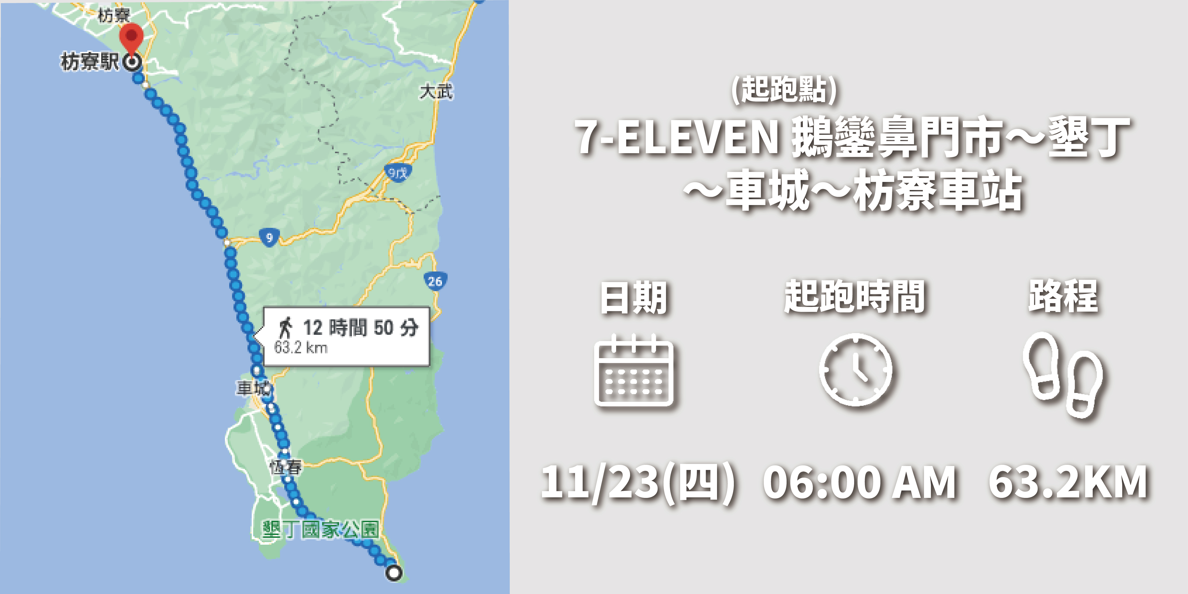 每日起點: 東吳大學~7-11金芝門市~羅東車站~全家 秀林和平店~林榮新光火車站~竹田派出所~7-11立麗門市~壽卡鐵馬驛站~7-11 鵝鑾鼻門市~枋寮車站~橋頭車站~八田與一紀念公園~雲林布袋戲館~台中科技大學~龍港車站~中壢火車站~東吳大學