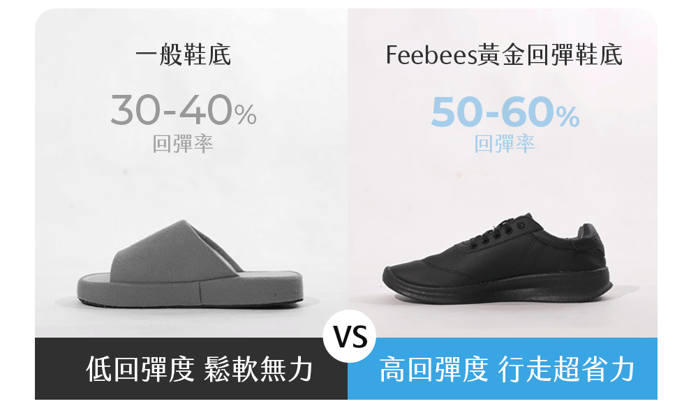Feebees 利用低密度高反彈的科技材料,打造恰到好處的 50%–60% 黃金回彈率。不僅喚醒你的足底肌群,更提供精準的推力與保護,讓你重拾輕鬆、正確的行走路徑。