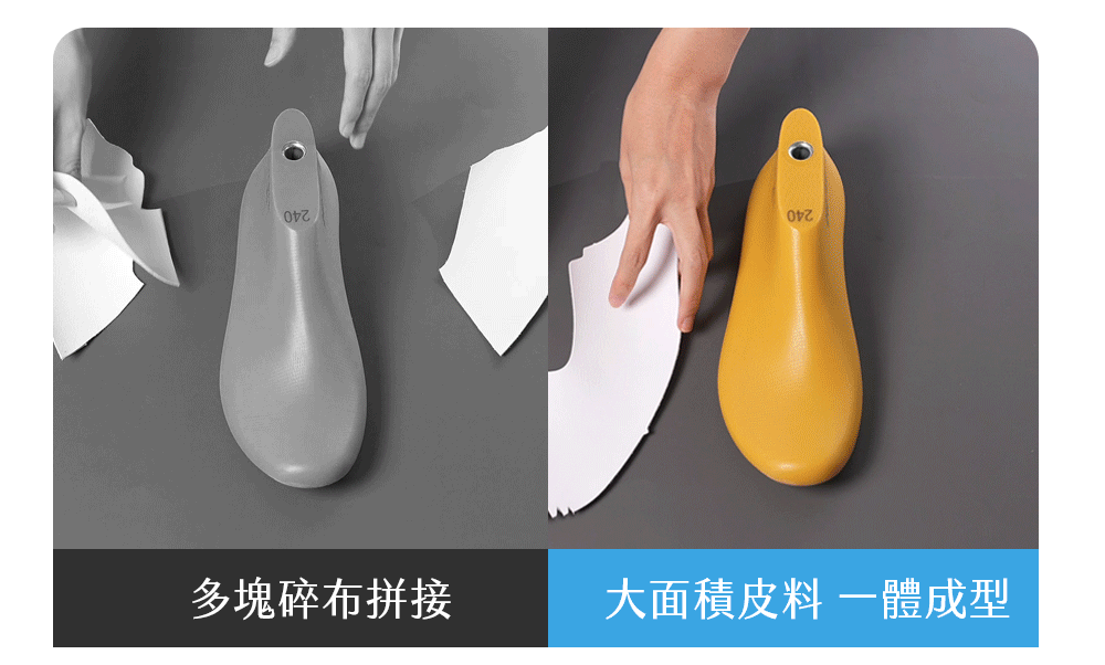 碎布拼接之間會有「段差」與「縫線」,久了膠水硬化,這就是磨腳的原因之一!